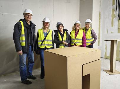 Die beauftragte Künstlerin, Meide Büdel, brachte dazu Entwürfe der Prinzipalien aus Pappe im Maßstab 1:1 mit, u.a. den Altar und den Ambo. Im Verbund mit aufgestellten Beispielstühlen konnten die Teilnehmenden ein Raumgefühl entwickeln und das Konzept weiter nachschärfen. Die Vorfreude war dabei den Kapellen-Erkundenden anzusehen. Auf dem Foto (v.l.n.r.): Pfarrer Jörg Hinderer, Dekanin Esther Philipps, Künstlerin Meide Büdel, Pastoralreferetin Anja Drechsle sowie Diakonin Eva Nübel. Zudem waren vor Ort der Projektleiter des Campus Neues Klinikum (Thomas Schumacher) und zwei kirchliche Architekt:innen (Ulrike Hautau und Markus Sauer).